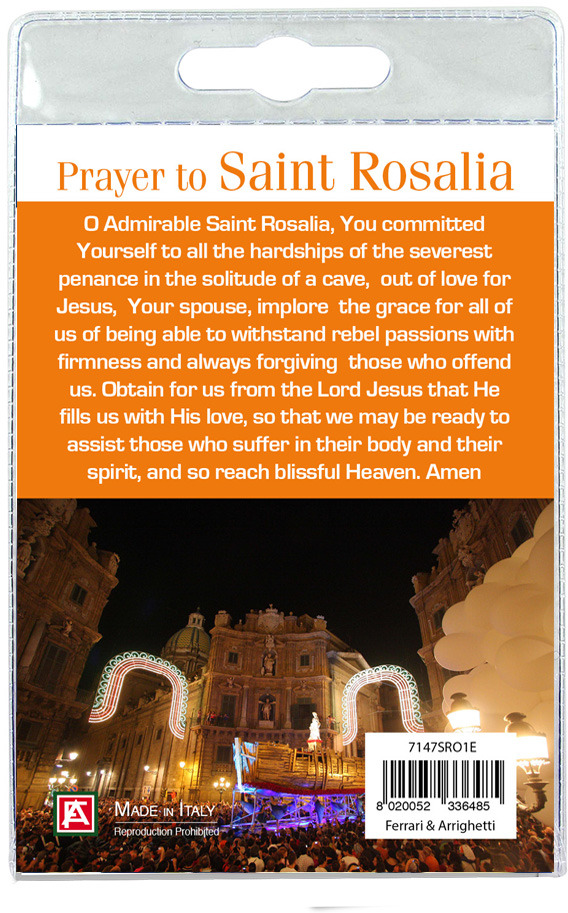 Il blister si presenta con all'interno un cartoncino, rappresentante Santa Rosalia.