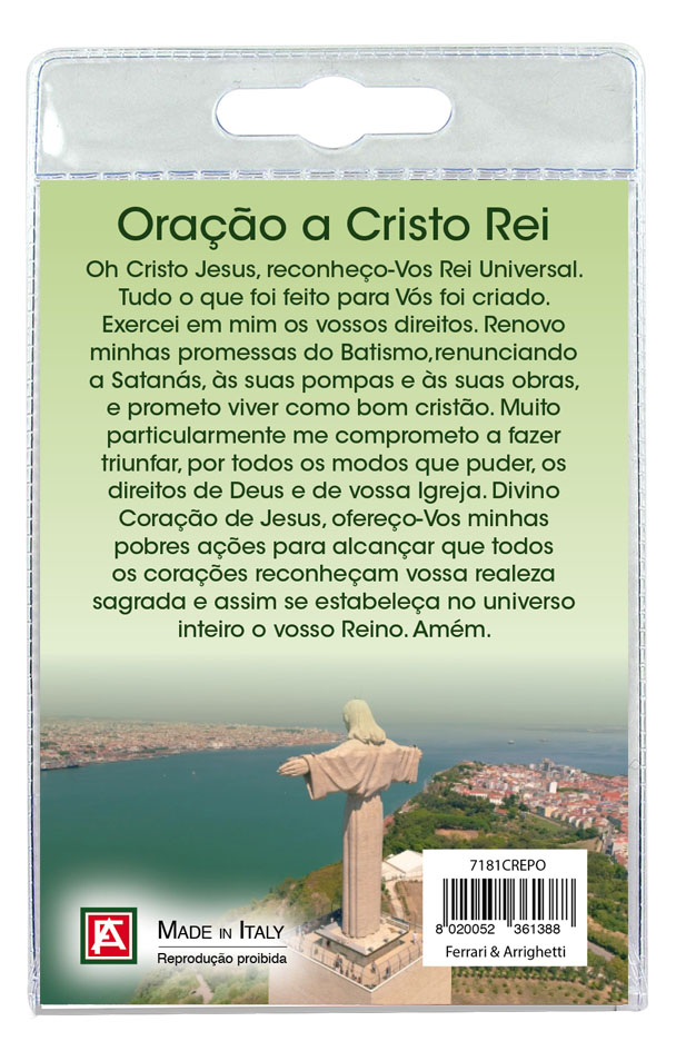 Realizzato in Italia viene consegnato in una bustina in plastica trasparente con all'interno una preghiera dedicata a Cristo Rei.