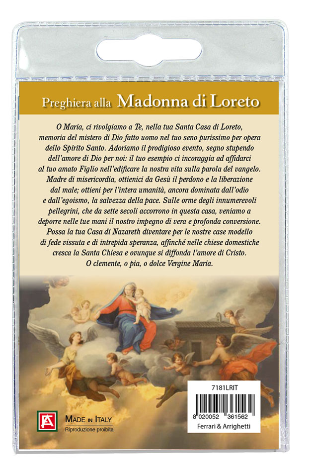 Realizzato in Italia viene consegnato in una bustina in plastica trasparente con all'interno una preghiera dedicata alla Madonna di Loreto, stampata su un cartoncino raffigurante la Madonna.