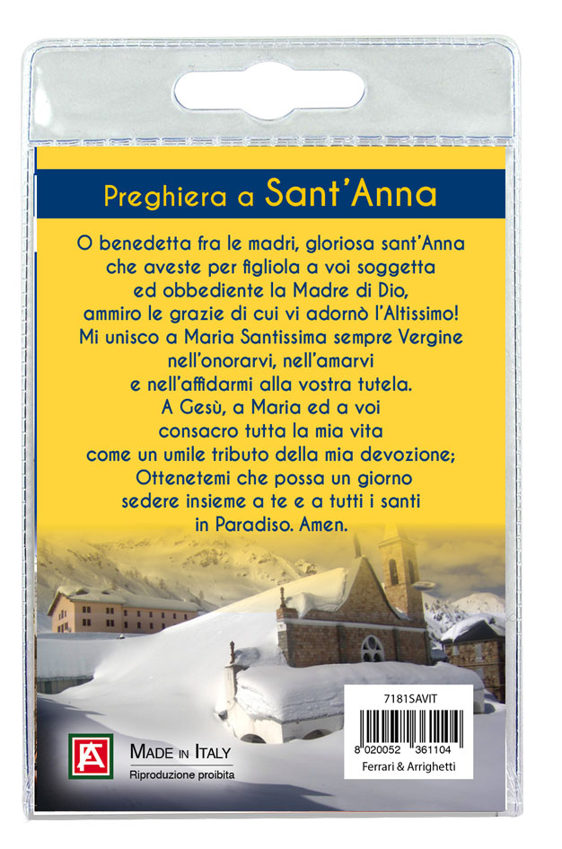 Realizzato in Italia viene consegnato in una bustina in plastica trasparente con all'interno la preghiera dedicata a Sant'Anna.