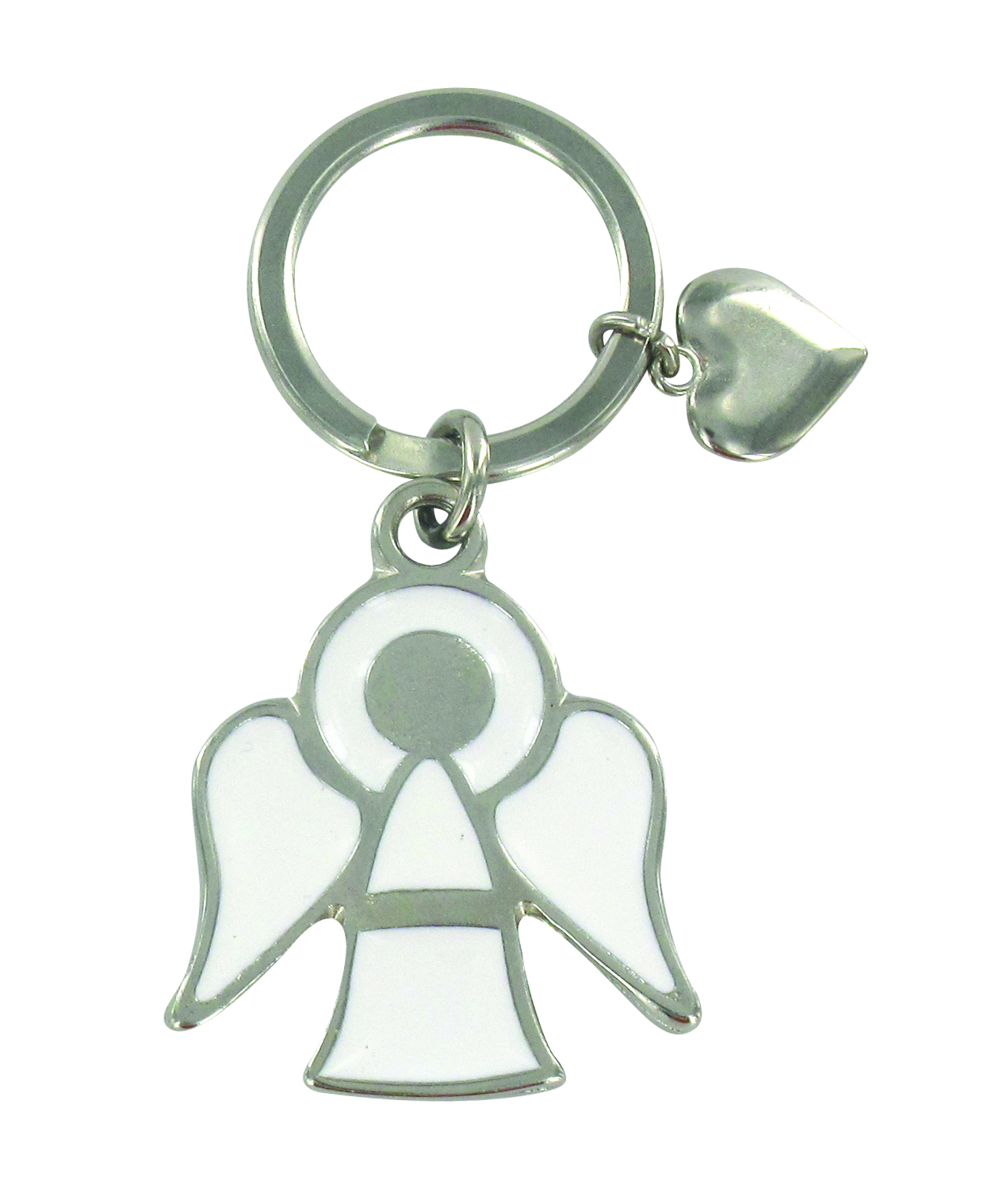 Portachiavi in metallo composto da un ciondolino a forma di cuore e un ciondolo più grosso a forma di angelo, quest'ultimo colorato con smalto bianco. Il prodotto è completamente realizzato in Italia, viene consegnato all'interno della sua scatola trasparente.