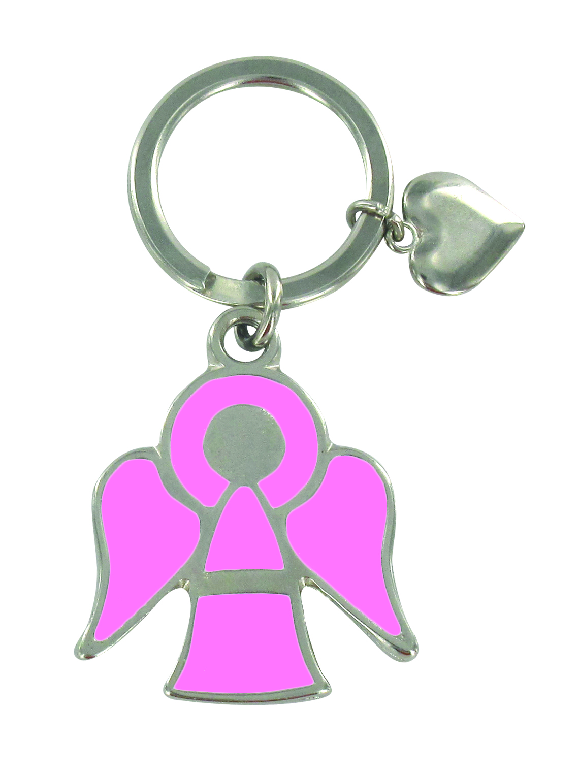 Portachiavi in metallo composto da un ciondolino a forma di cuore e un ciondolo più grosso a forma di angelo, quest'ultimo colorato con smalto rosa. Il prodotto è completamente realizzato in Italia, viene consegnato all'interno della sua scatola trasparente.