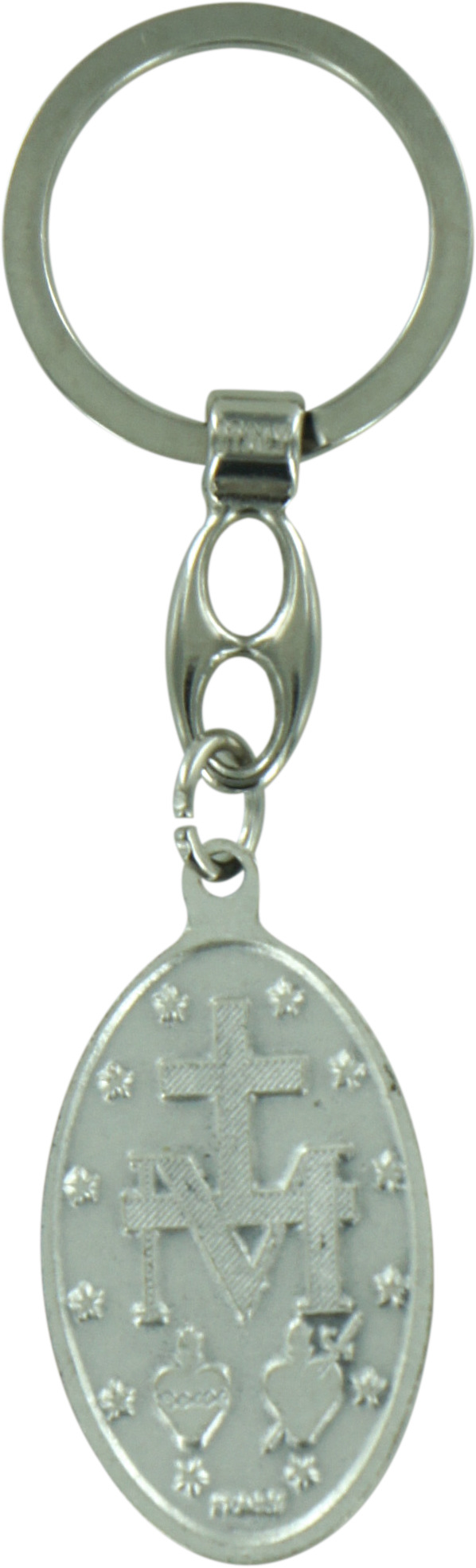 Portachiavi raffigurante la Madonna Miracolosa realizzato in metallo argentato con smalto di colore blù. Il gancio del prtachiave è invece realizzato in metallo argentato nichelato. Il medaglione misura cm 4,5 comprensivo di anello fisso.