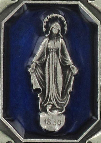 Portachiavi in metallo nichelato a forma di pergamena con smalto blu che circonda la placchetta in metallo raffigurante la Madonna Miracolosa.