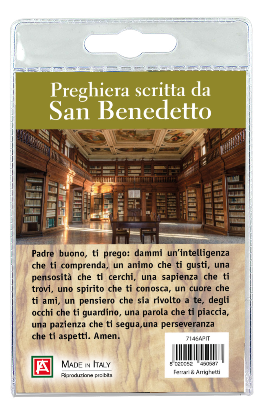 Il Portachiavi è confezionato in un blister con all'interno un immagine di San Benedetto sul cui retro e' stampata una preghiera da lui scritta.