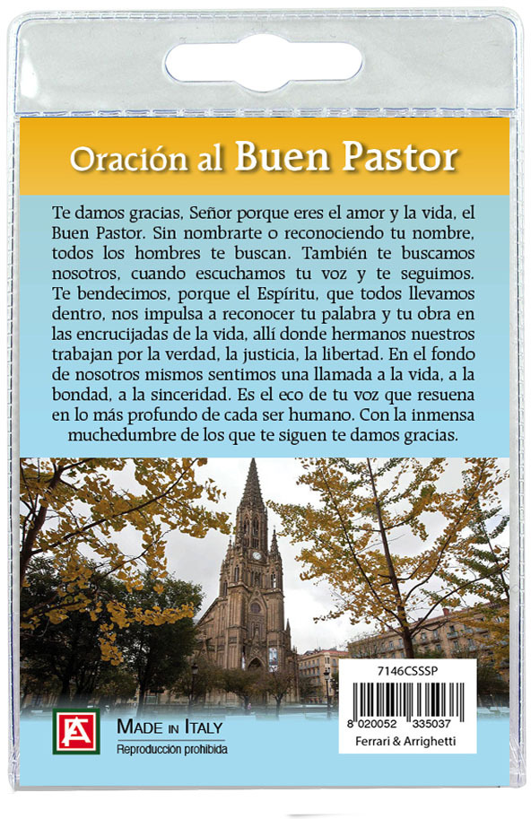 Il Portachiavi è confezionato in un blister con all'interno un immagine del Buon Pastor sul cui retro e' stampata una preghiera in spagnolo.