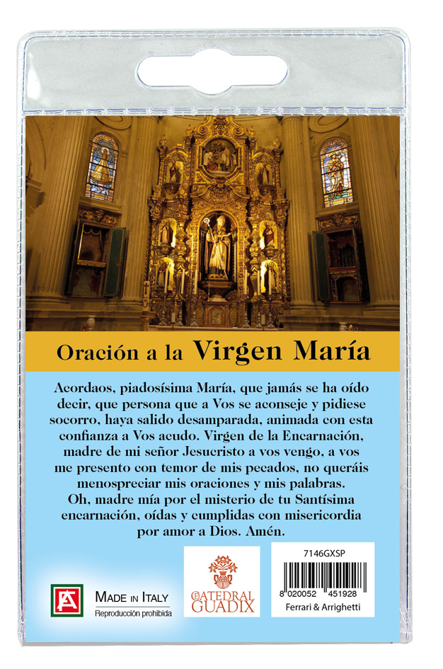 Il Portachiavi è confezionato in un blister con all'interno un immagine della Basilica sul cui retro e' stampata una preghiera in spagnolo.