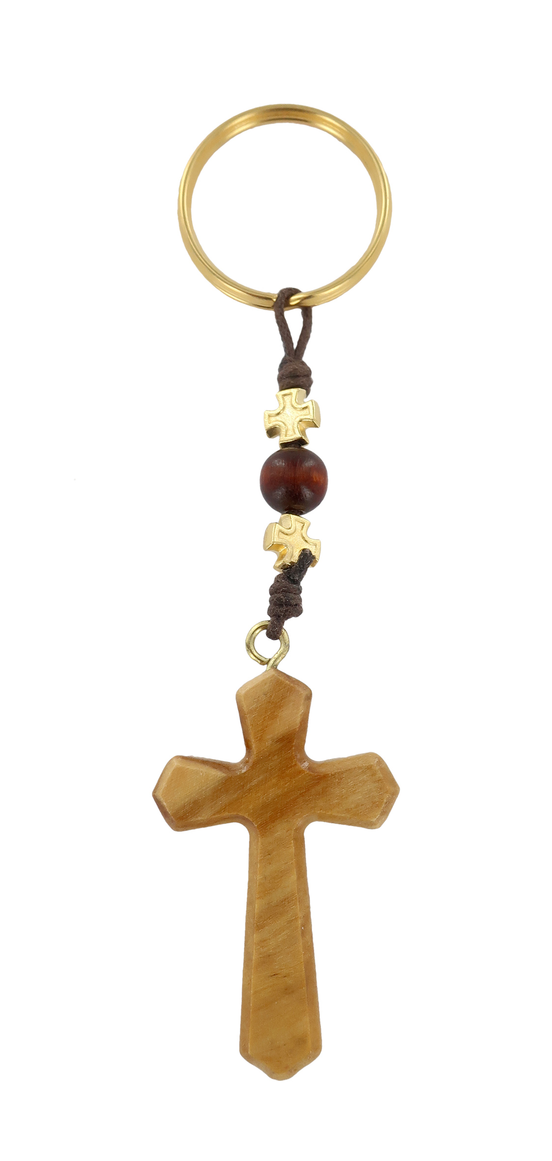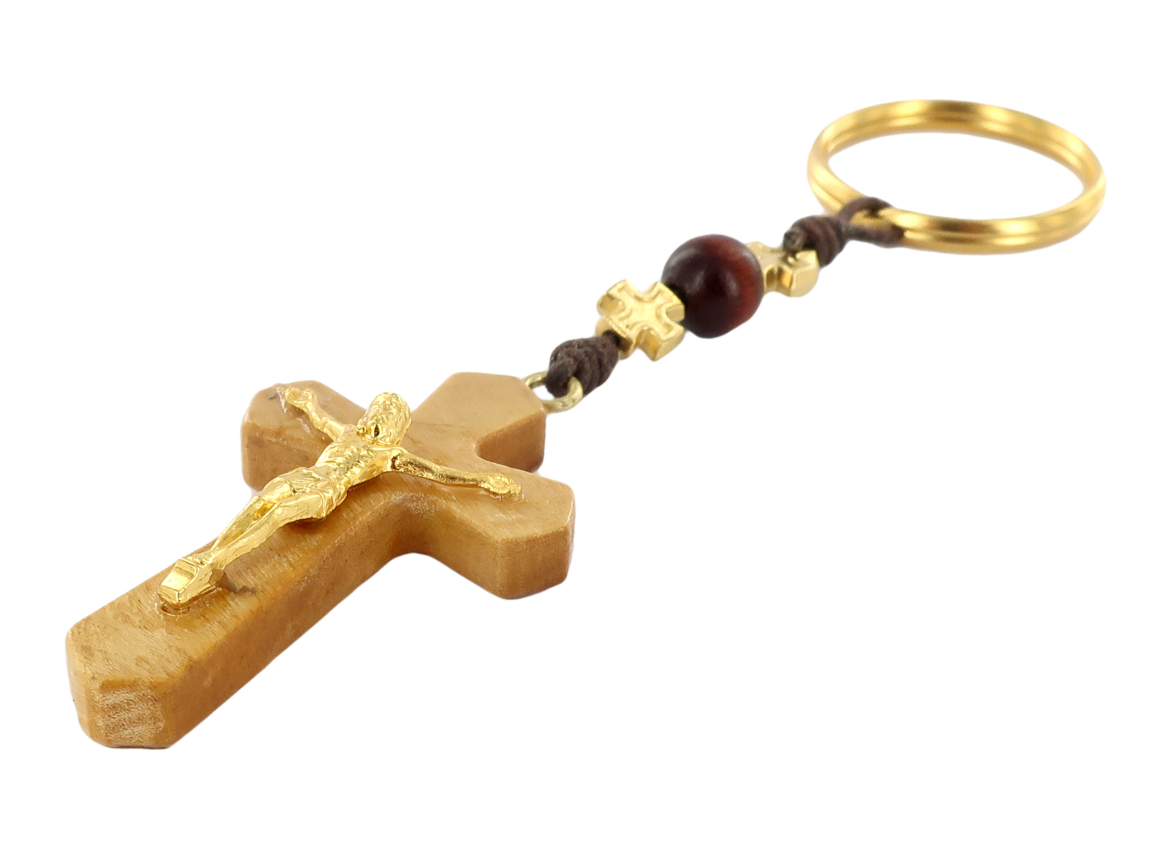 Portachiavi croce ulivo con cristo dorato e croci metallo