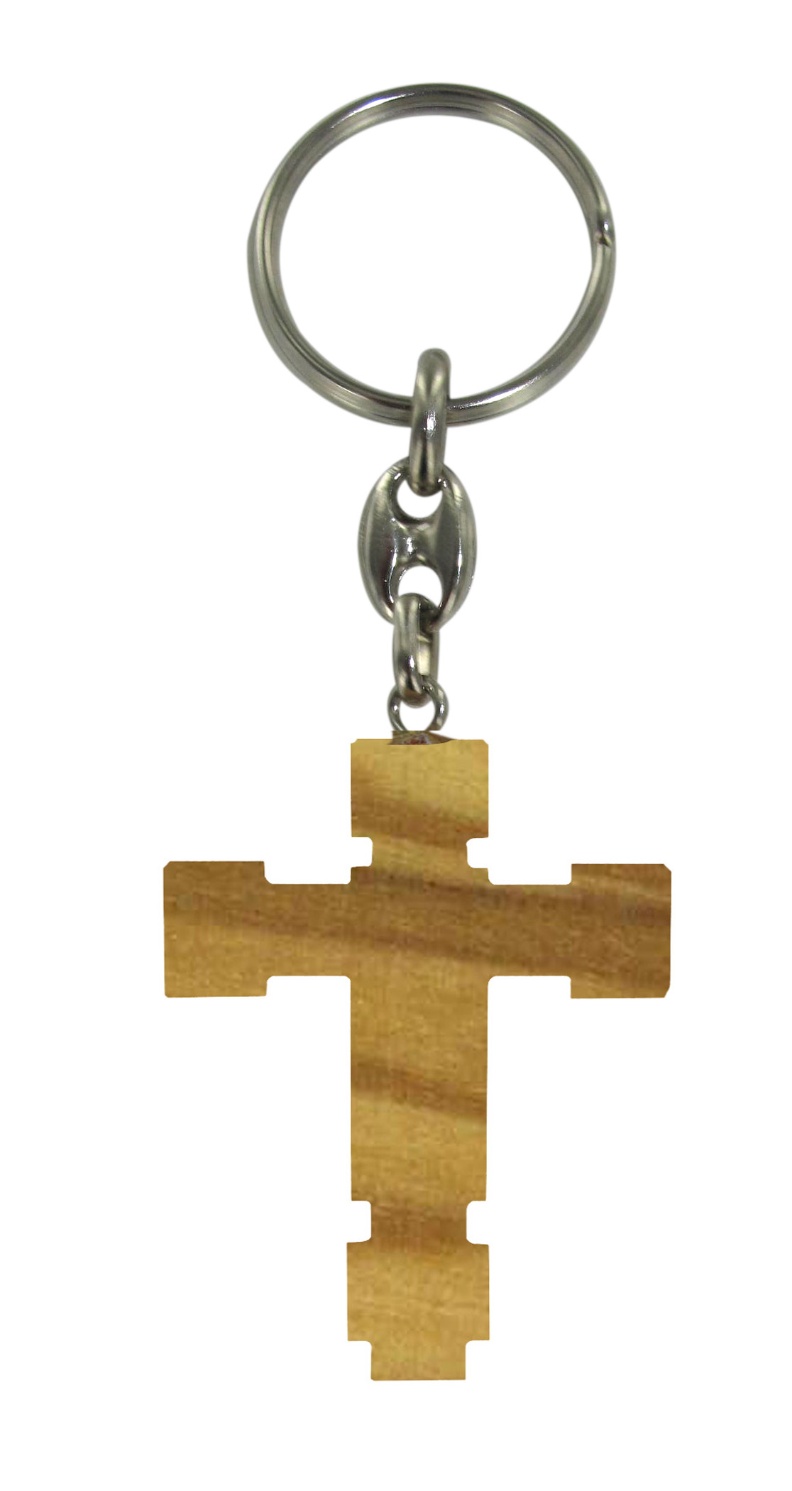 Portachiavi sagomato in legno d'ulivo con grano e con l'immagine serigrafata del Crocifisso della Cattedrale di Westminster.