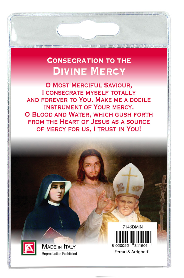 Il Portachiavi è confezionato in un blister con all'interno un immagine sul cui retro è stampata una preghiera in inglese.