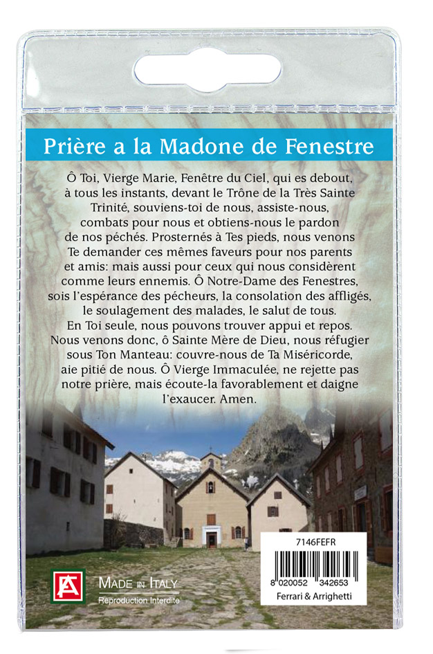 Il Portachiavi è confezionato in un blister con all'interno un immagine della Madonna sul cui retro è stampata una preghiera a lei dedicata *(in francese).