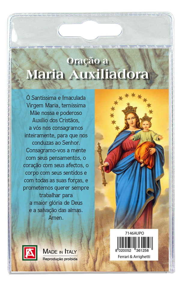 Il Portachiavi è confezionato in un blister con all'interno un immagine della Madonna Ausiliatrice sul cui retro è stampata una preghiera a lei dedicata *(in portoghese).