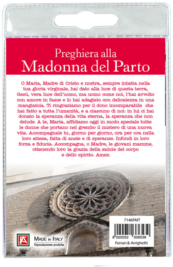 Il Portachiavi è confezionato in un blister con all'interno un immagine del santuario sul cui retro e' stampata una preghiera dedicata alla Vergine Maria.