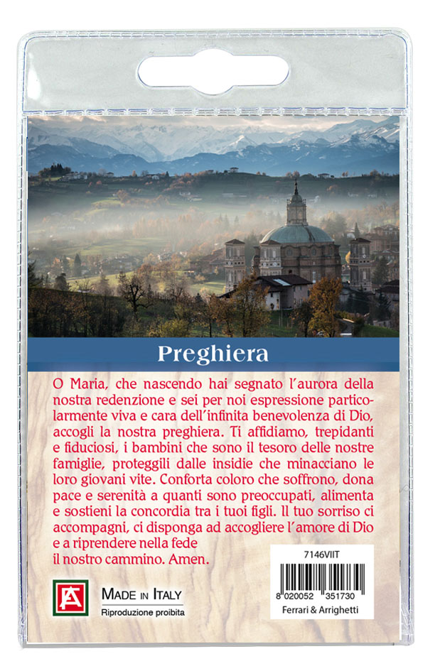 Il Portachiavi è confezionato in un blister con all'interno un immagine della Madonna del Santuario di Vicoforte (Mondovì) sul cui retro e' stampata una preghiera dedicata alla Vergine Maria.