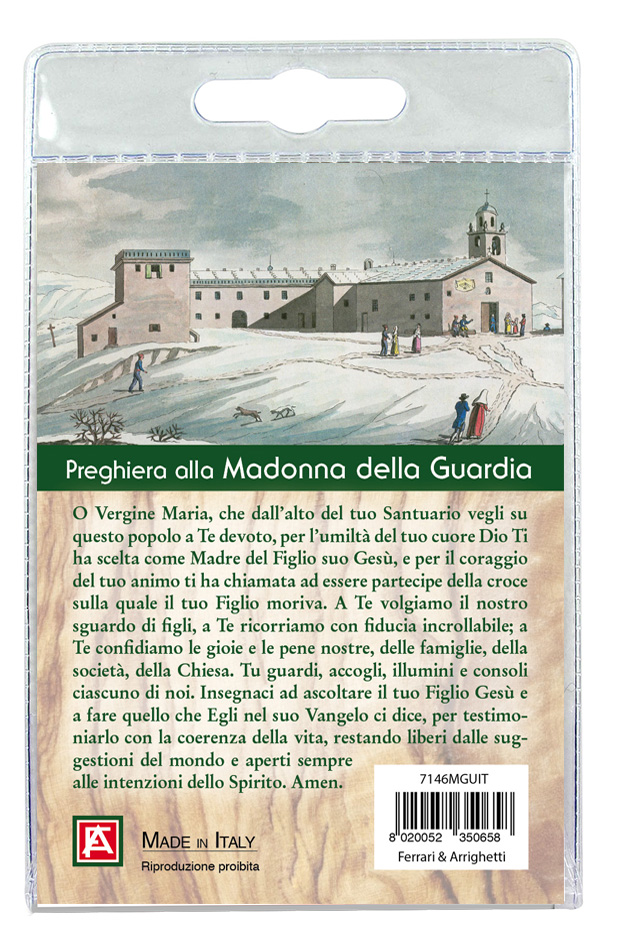 Il Portachiavi è confezionato in un blister con all'interno un immagine dell'aparizione della Madonna sul cui retro è stampata una preghiera dedicata alla Madonna della guardia.