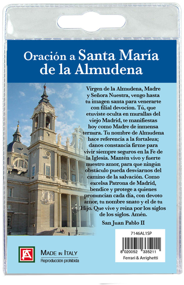 Il Portachiavi è confezionato in un blister con all'interno un immagine della Madonna di Almudena sul cui retro e' stampata una preghiera in spagnolo.