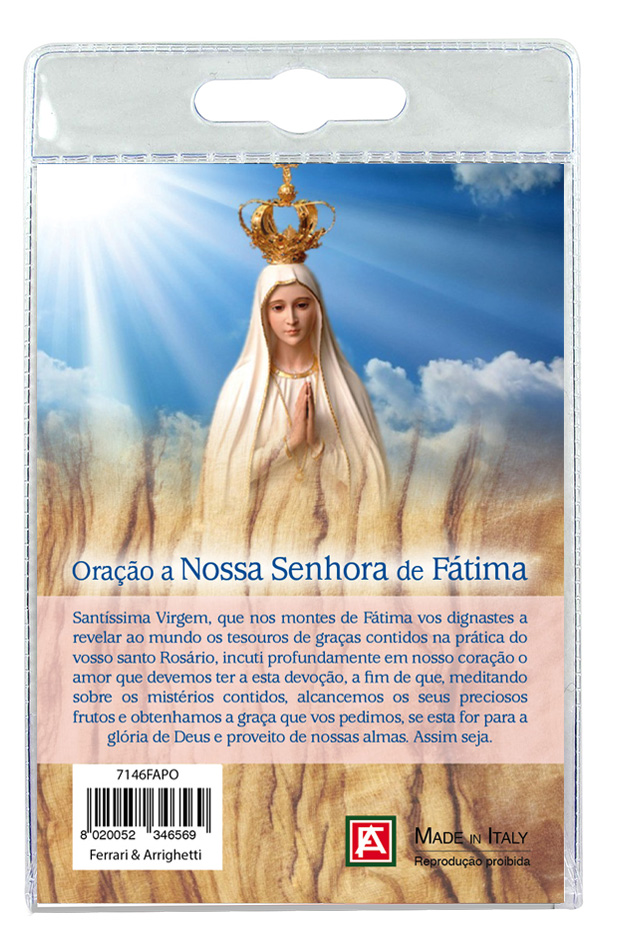 Il Portachiavi è confezionato in un blister con all'interno un immagine dell'apparizione di Fatima sul cui retro è stampata una preghiera in portoghese.