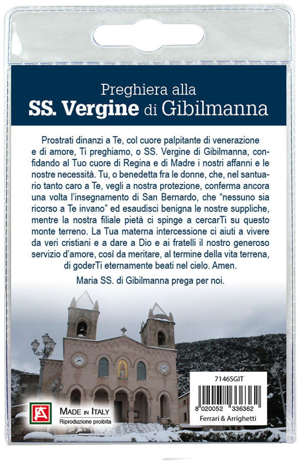 Il Portachiavi è confezionato in un blister con all'interno un immagine della Madonna sul cui retro e' stampata una preghiera in italiano.