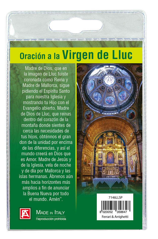 Il portachiave è confezionato in un blister con all'interno un immagine di Madonna di Lluc sul cui retro e' stampata una preghiera.