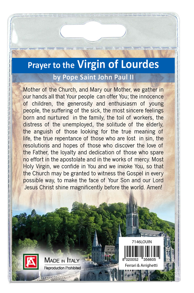 Il portachiave è confezionato in un blister con all'interno un immagine sul cui retro è stampata una preghiera in inglese.
