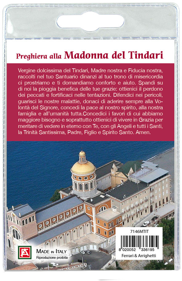 Il Portachiavi è confezionato in un blister con all'interno un immagine del santuario sul cui retro e' stampata una preghiera dedicata alla Vergine Maria.