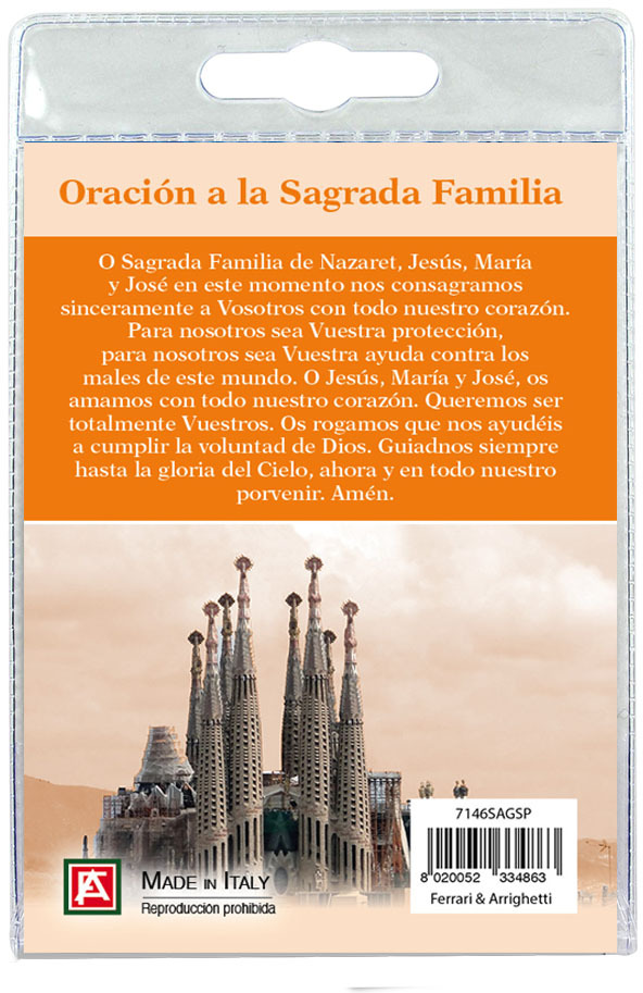 Il Portachiavi è confezionato in un blister con all'interno un immagine della Basilica sul cui retro e' stampata una preghiera in spagnolo.