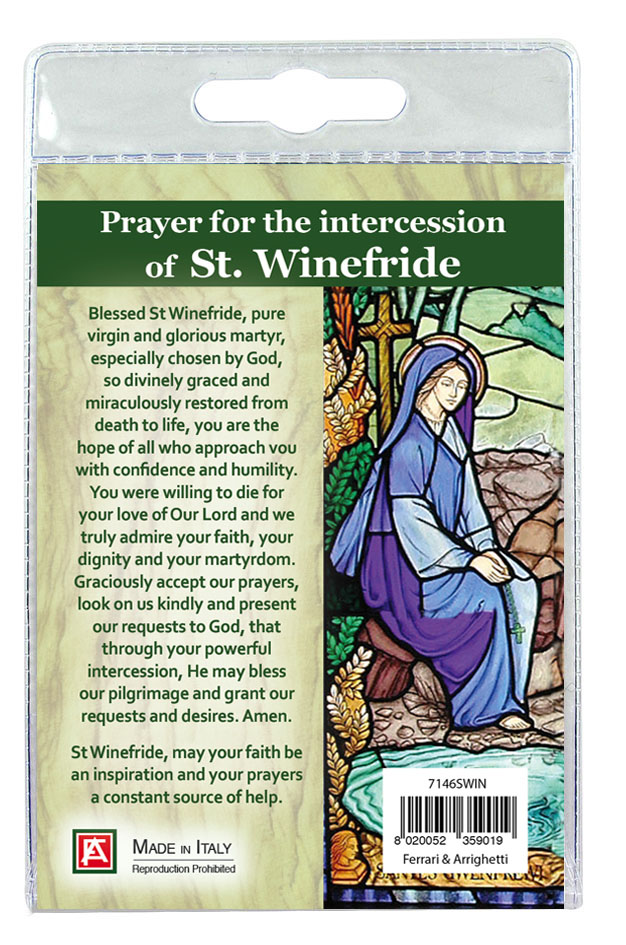 Il portachiave è confezionato in un blister con all'interno un immagine di Santa Winefride sul cui retro e' stampata una preghiera.