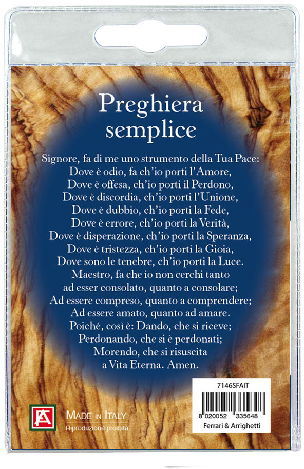 Il Portachiavi è confezionato in un blister con all'interno un'immagine di San Francesco Assisi sul cui retro e' stampata una preghiera.