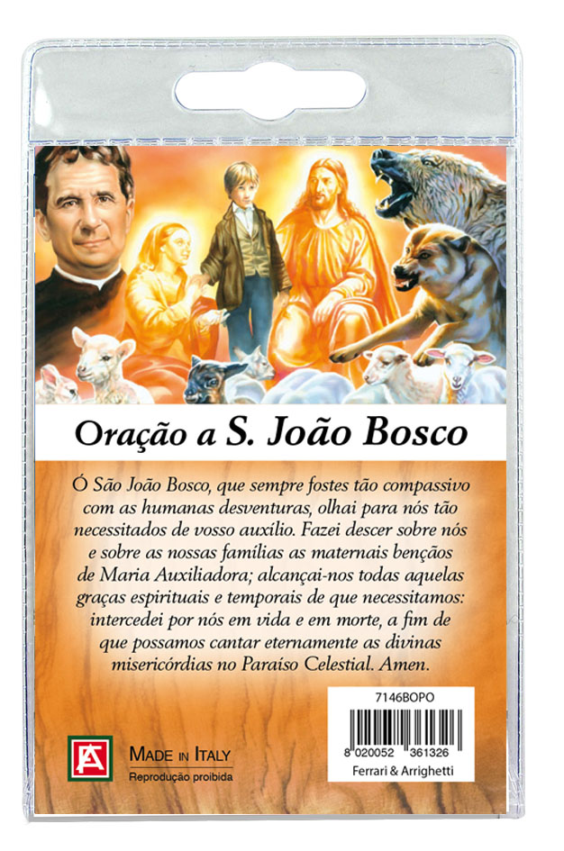 Il Portachiavi è confezionato in un blister con all'interno un immagine di San Giovanni Bosco sul cui retro è stampata una preghiera in portoghese.