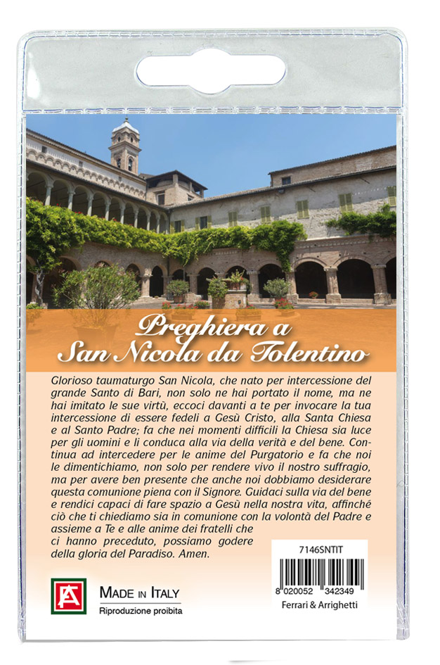 Il Portachiavi è confezionato in un blister con all'interno un immagine del Santo sul cui retro è stampata una preghiera a lui dedicata.