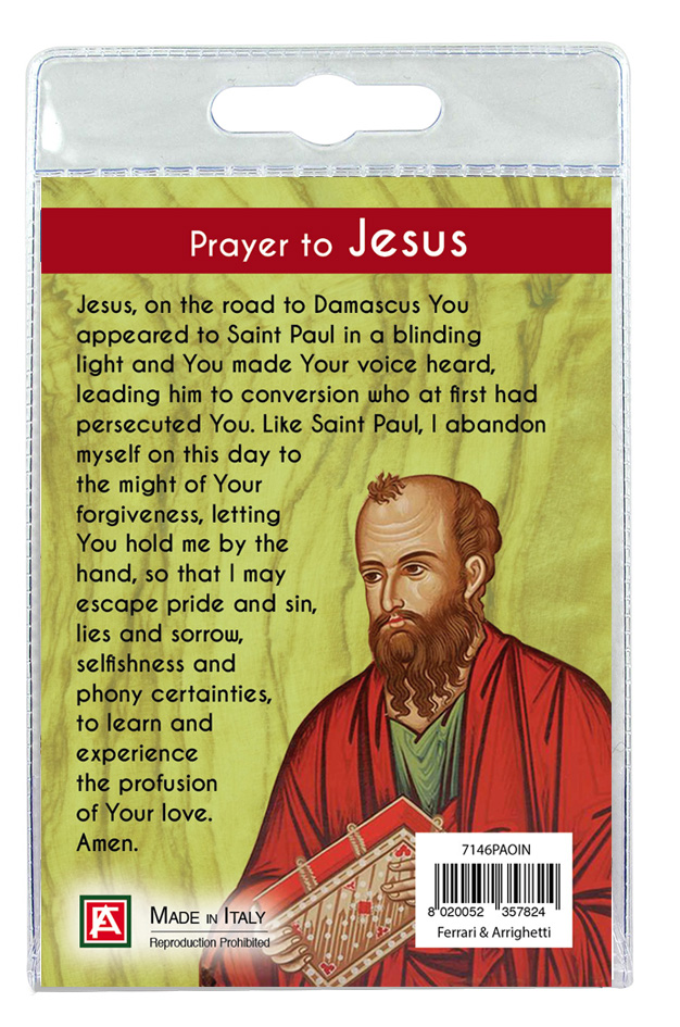Il Portachiavi è confezionato in un blister con all'interno un immagine di San Paolo apostolo sul cui retro è stampata una preghiera dedicata a Gesù *(in inglese).