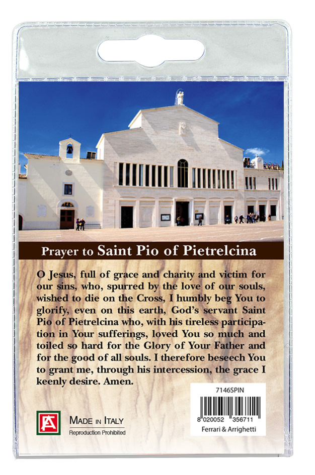 Il portachiave è confezionato in un blister con all'interno un immagine di San Pio sul cui retro è stampata una preghiera a lui dedicata *(in inglese).