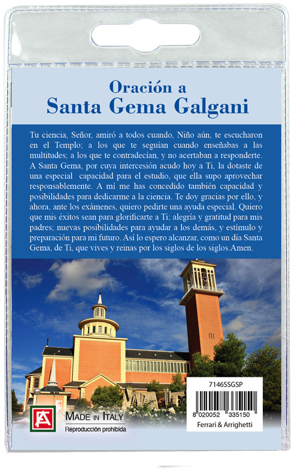 Il Portachiavi è confezionato in un blister con all'interno un immagine della Santa sul cui retro e' stampata una preghiera in spagnolo.