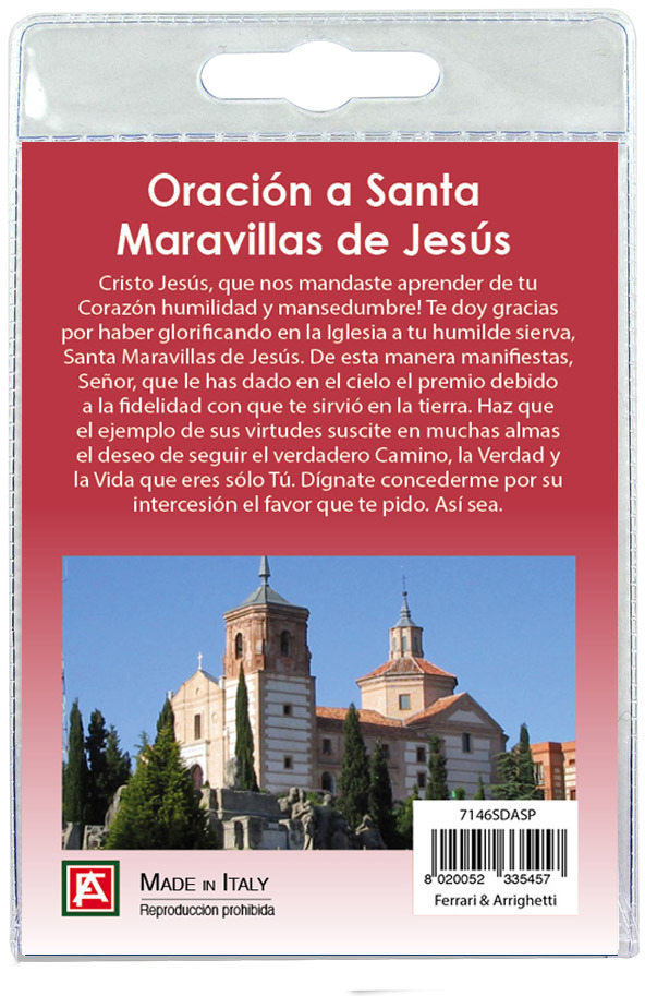 Il Portachiavi è confezionato in un blister con all'interno un immagine della Santa Maravillas de Jesus sul cui retro e' stampata una preghiera in spagnolo.