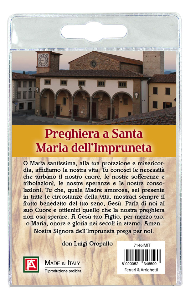 Il Portachiavi è confezionato in un blister con all'interno un immagine del santuario sul cui retro è stampata una preghiera.