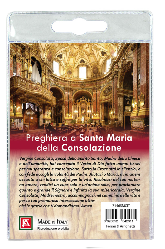 Il Portachiavi è confezionato in un blister con all'interno un immagine di Santa Maria della Consolazione sul cui retro è stampata una preghiera a lei dedicata.