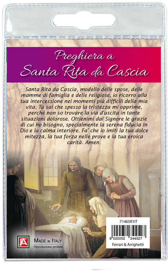 Il Portachiavi è confezionato in un blister con all'interno un immagine di Santa Rita (Barona Milano) sul cui retro è stampata una preghiera in italiano.