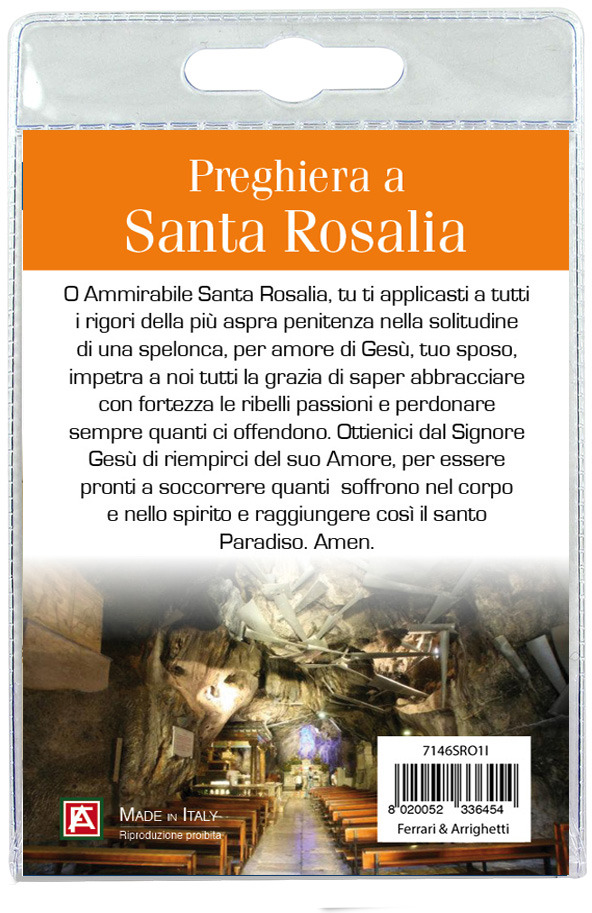 Il Portachiavi è confezionato in un blister con all'interno un immagine di Santa Rosalia sul cui retro e' stampata una preghiera in italiano.