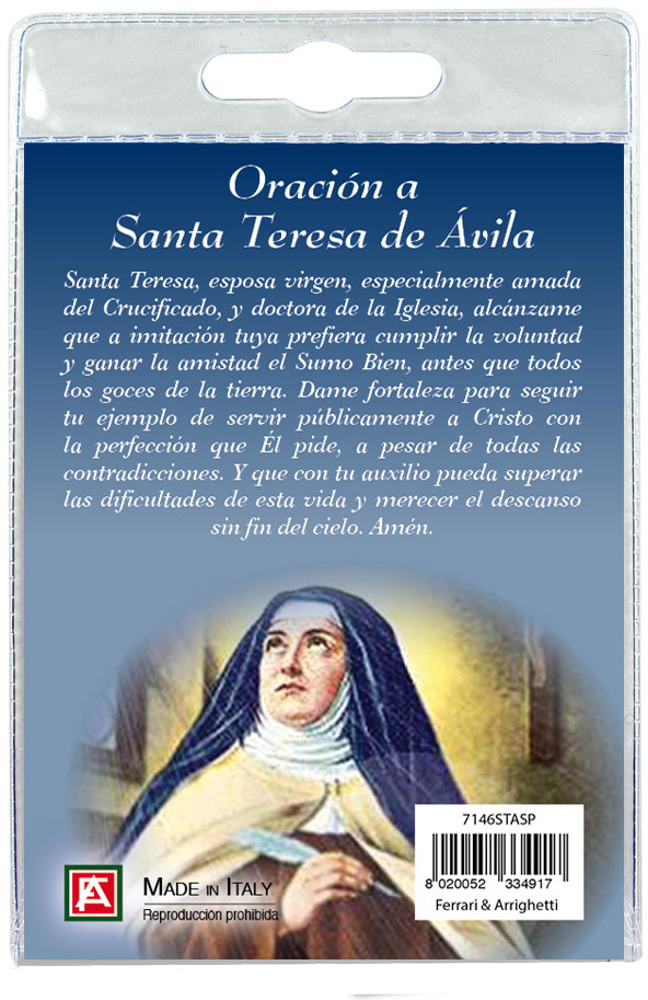 Il Portachiavi è confezionato in un blister con all'interno un immagine di Santa Teresa d'Avila sul cui retro e' stampata una preghiera in spagnolo.