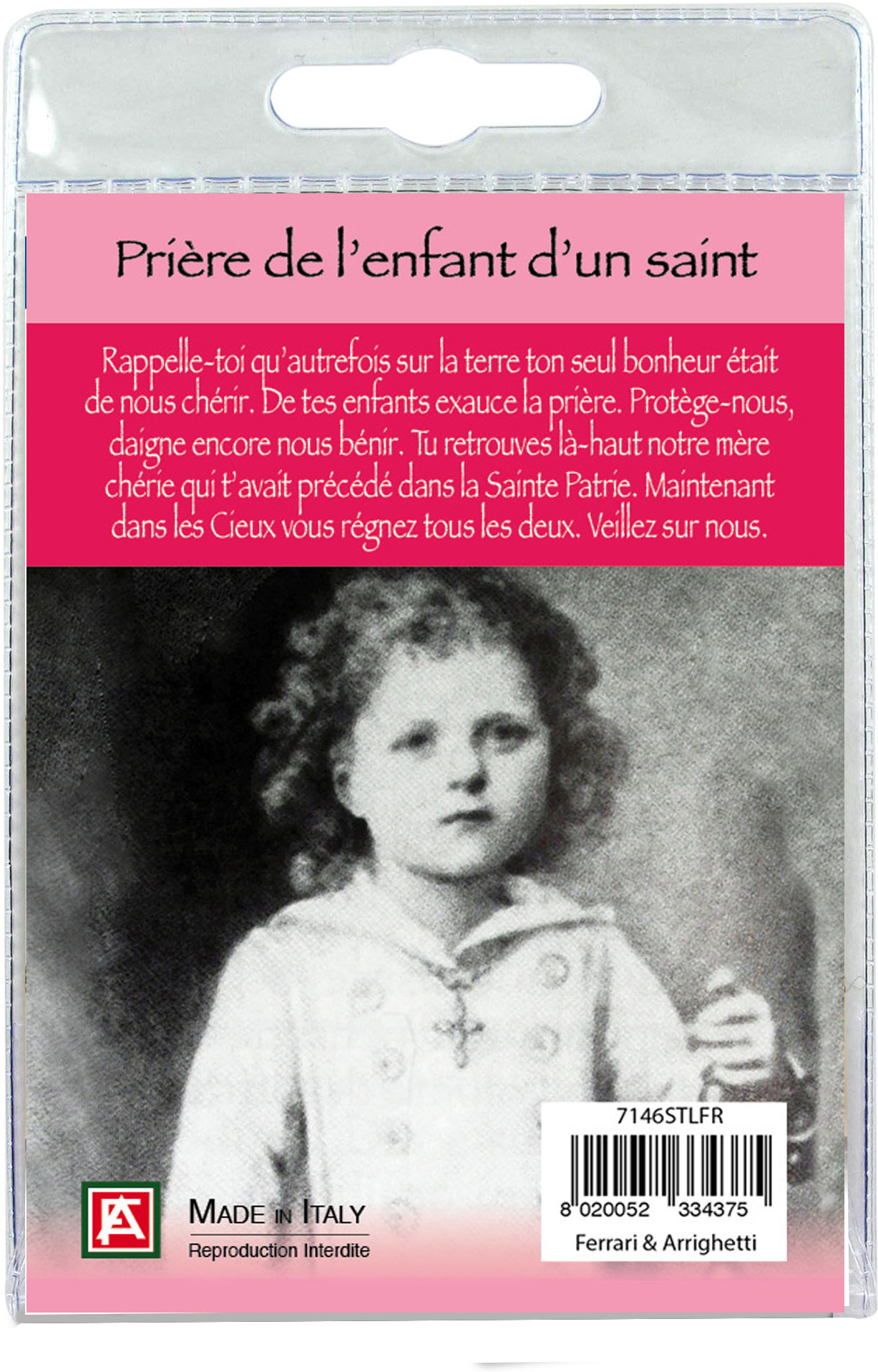 Il Portachiavi è confezionato in un blister con all'interno un immagine di Santa Teresa sul cui retro e' stampata una preghiera.