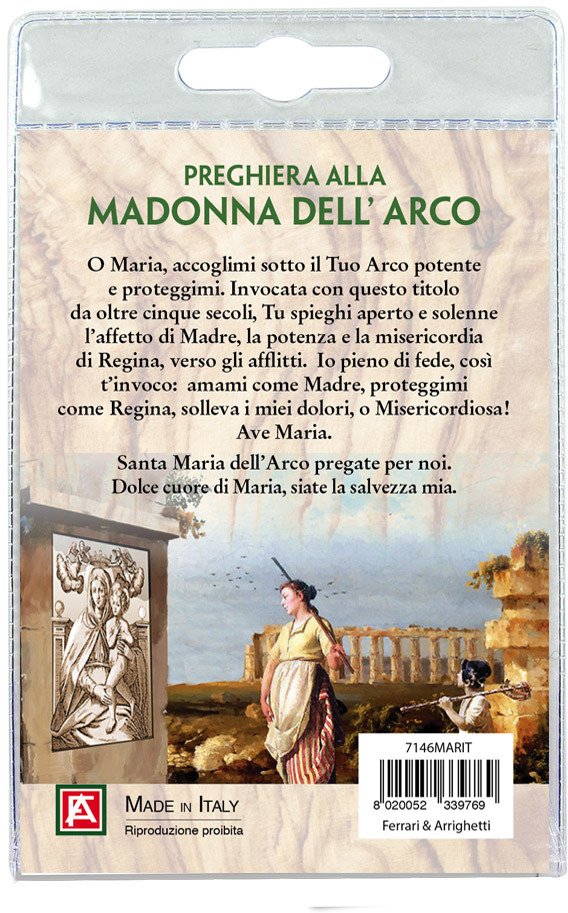 Il Portachiavi è confezionato in un blister con all'interno un immagine di Santuario Madonna dell'Arco sul cui retro e' stampata una preghiera.