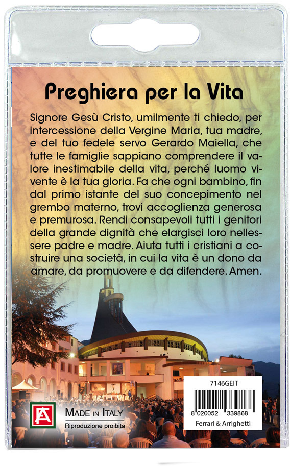 Il Portachiavi è confezionato in un blister con all'interno un immagine di San Gerardo sul cui retro e' stampata una preghiera.