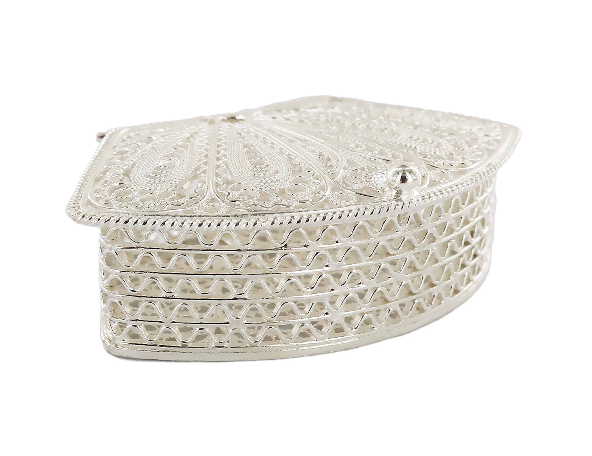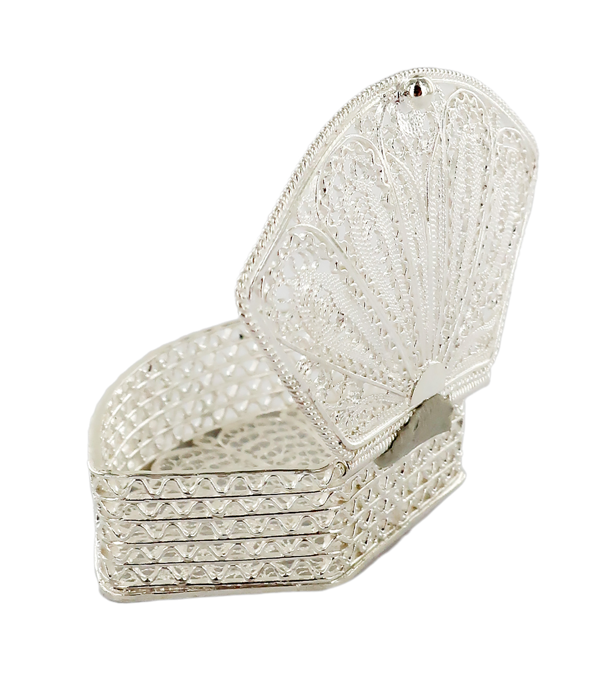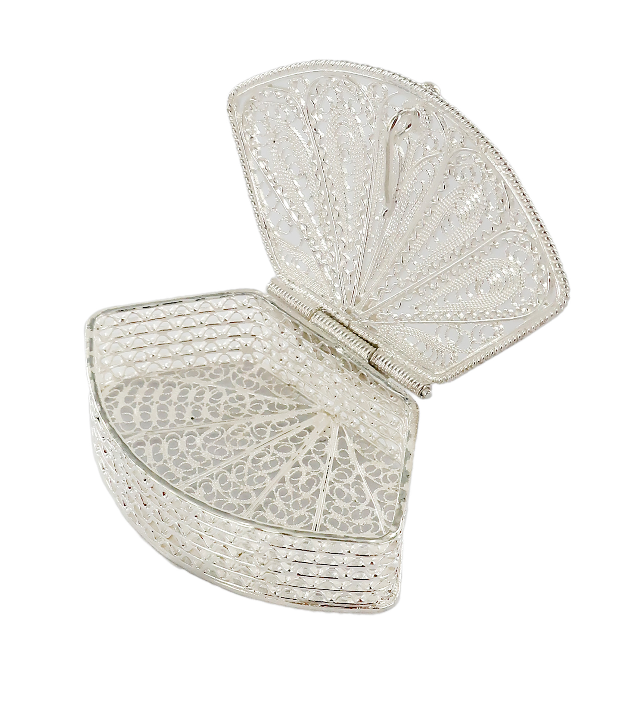Scatolina a forma di ventaglio in filigrana e argento 925.