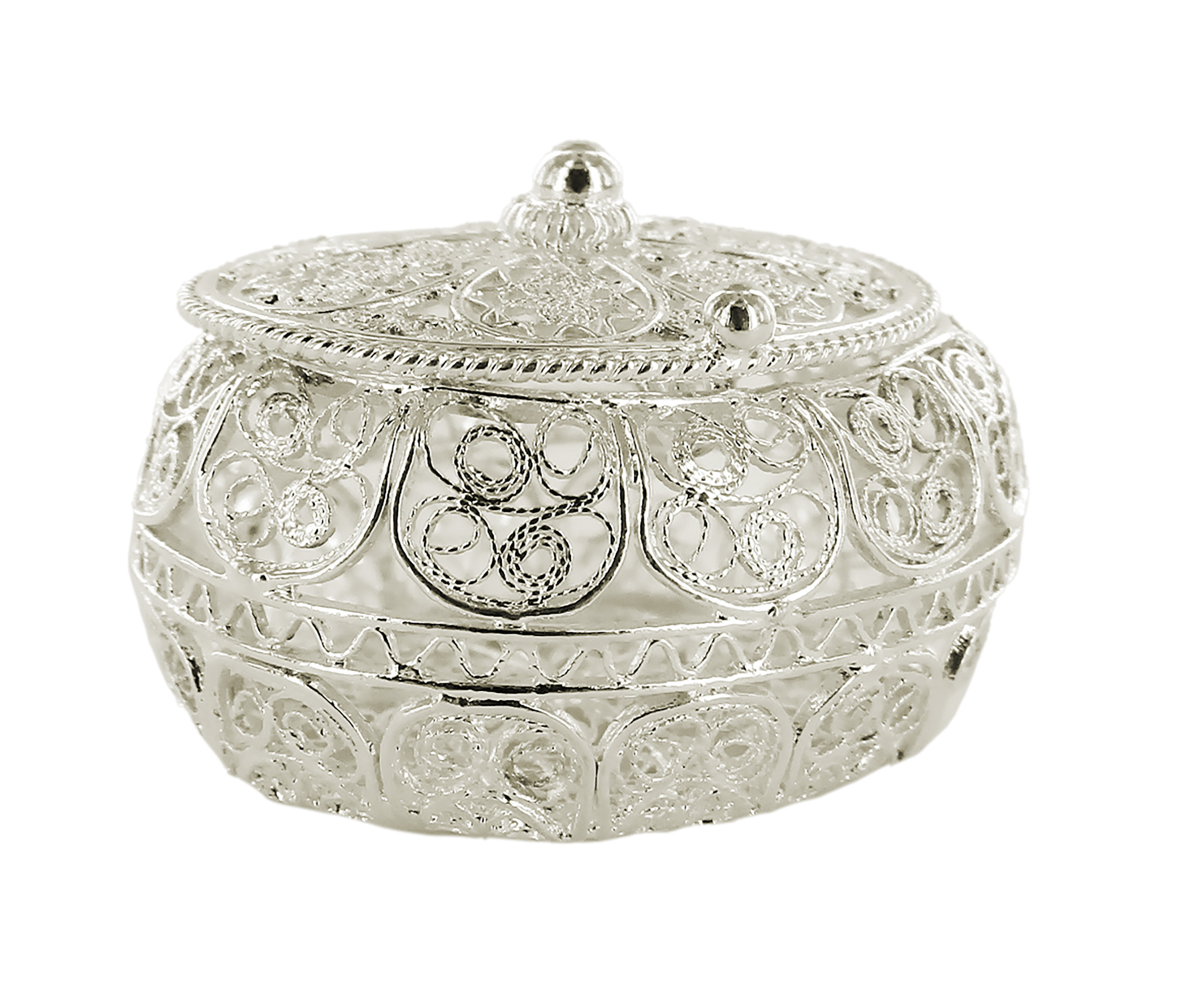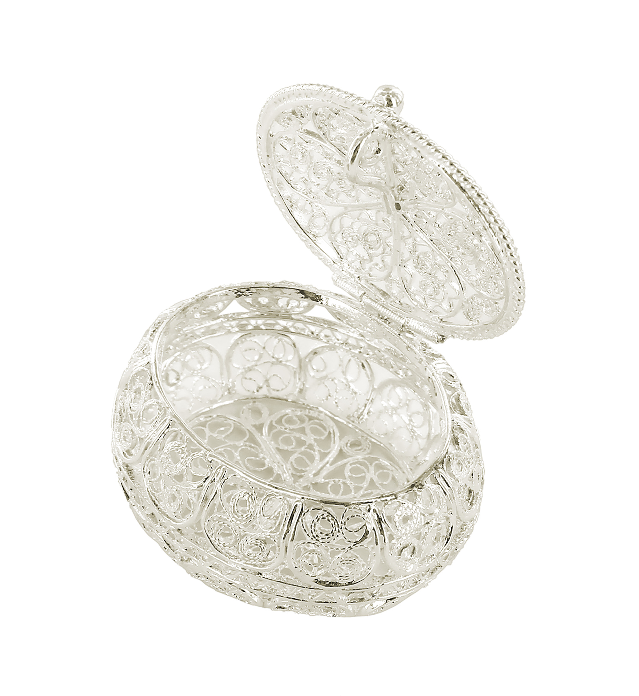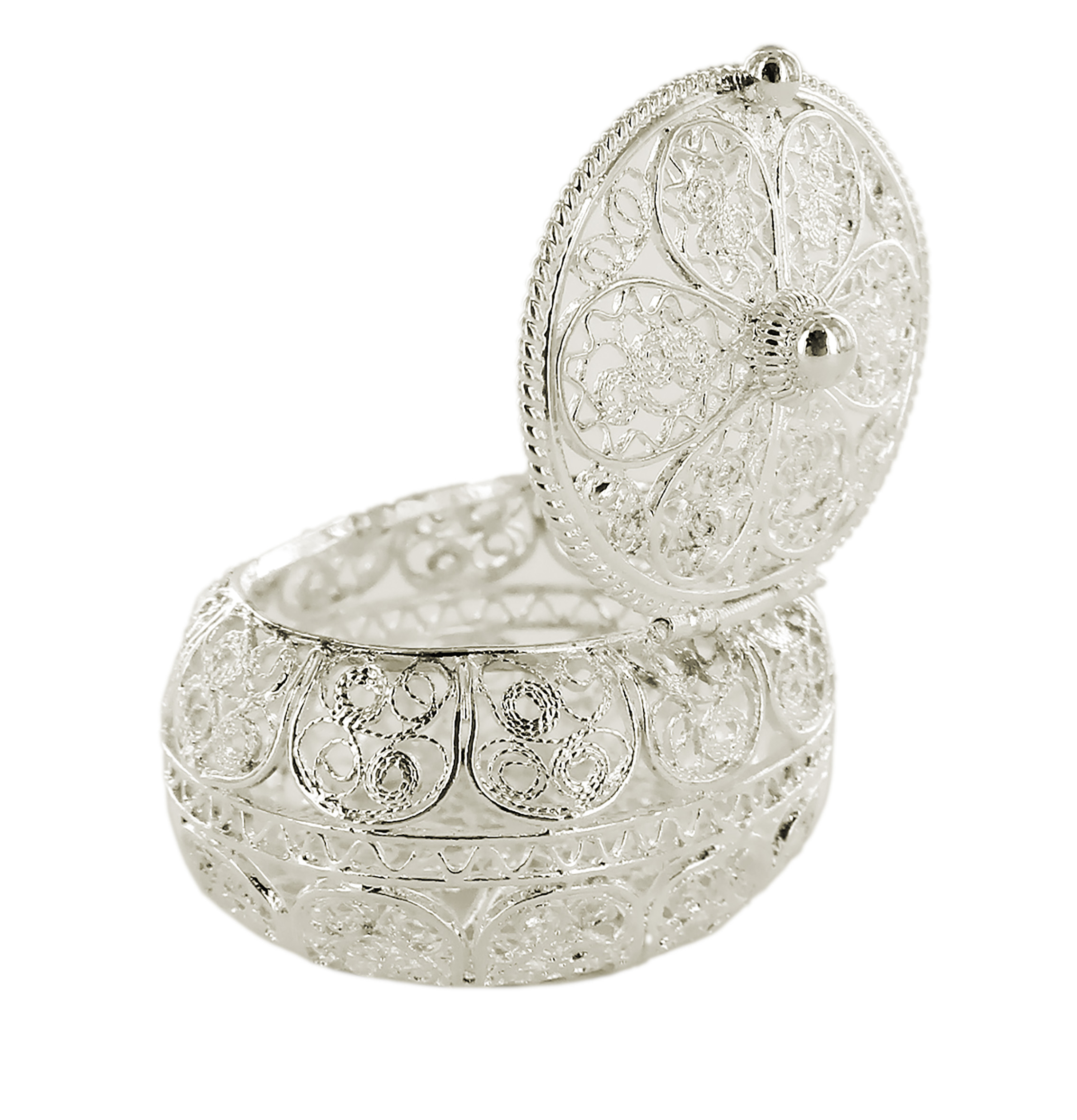 Scatolina a forma ovale in filigrana e argento 925.