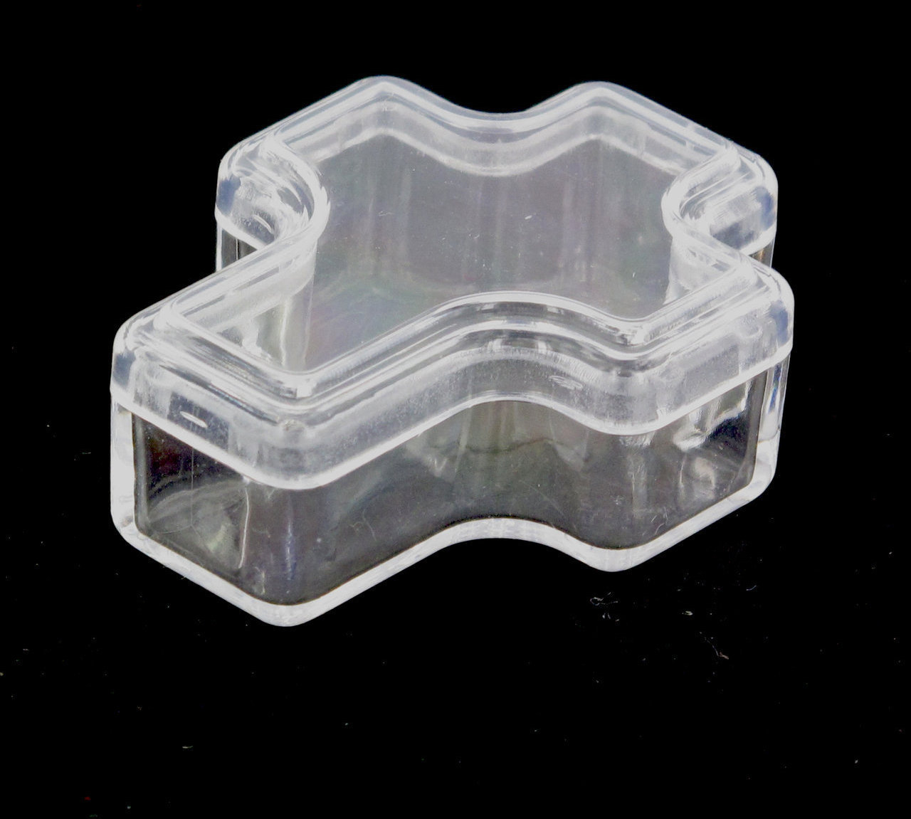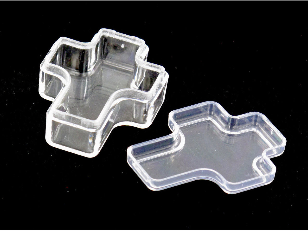 Originale scatolina portarosario in plastica rigida trasparente a forma di croce.