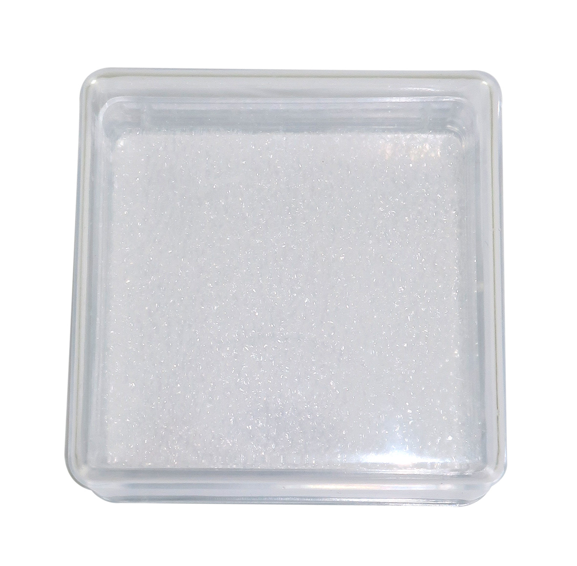 Scatolina quadrata portarosario in plastica rigida bianca e coperchio trasparente con all'interno una spugna bianca.
