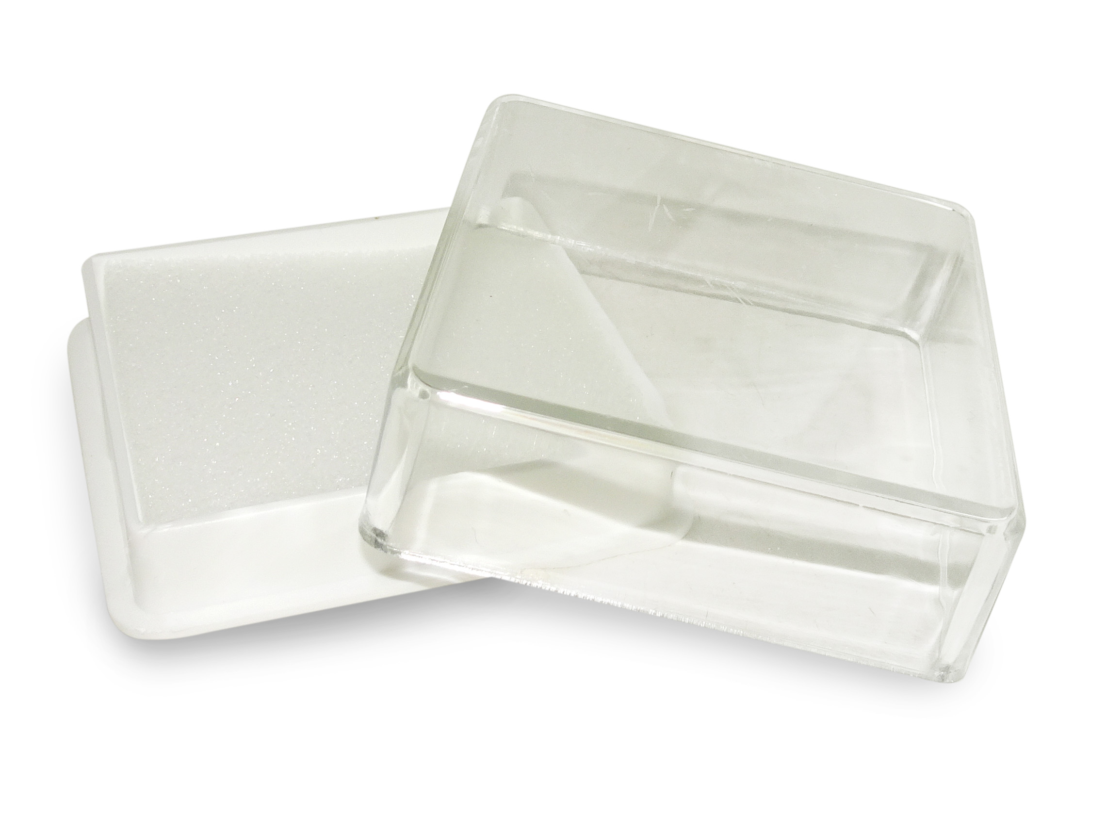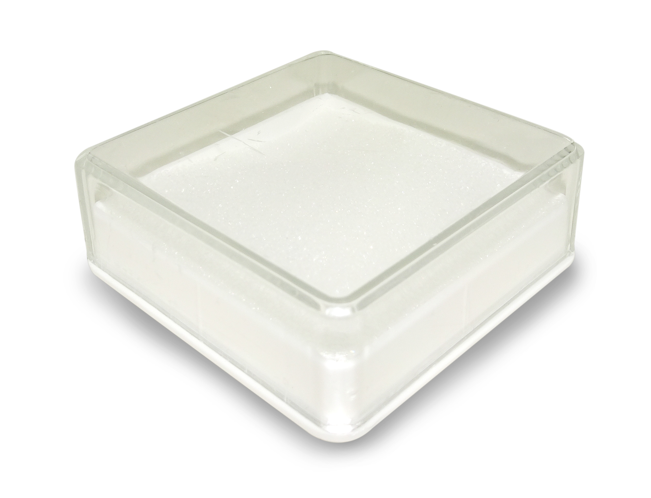 Scatolina quadrata portarosario in plastica rigida bianca e coperchio trasparente con all'interno una spugna bianca.