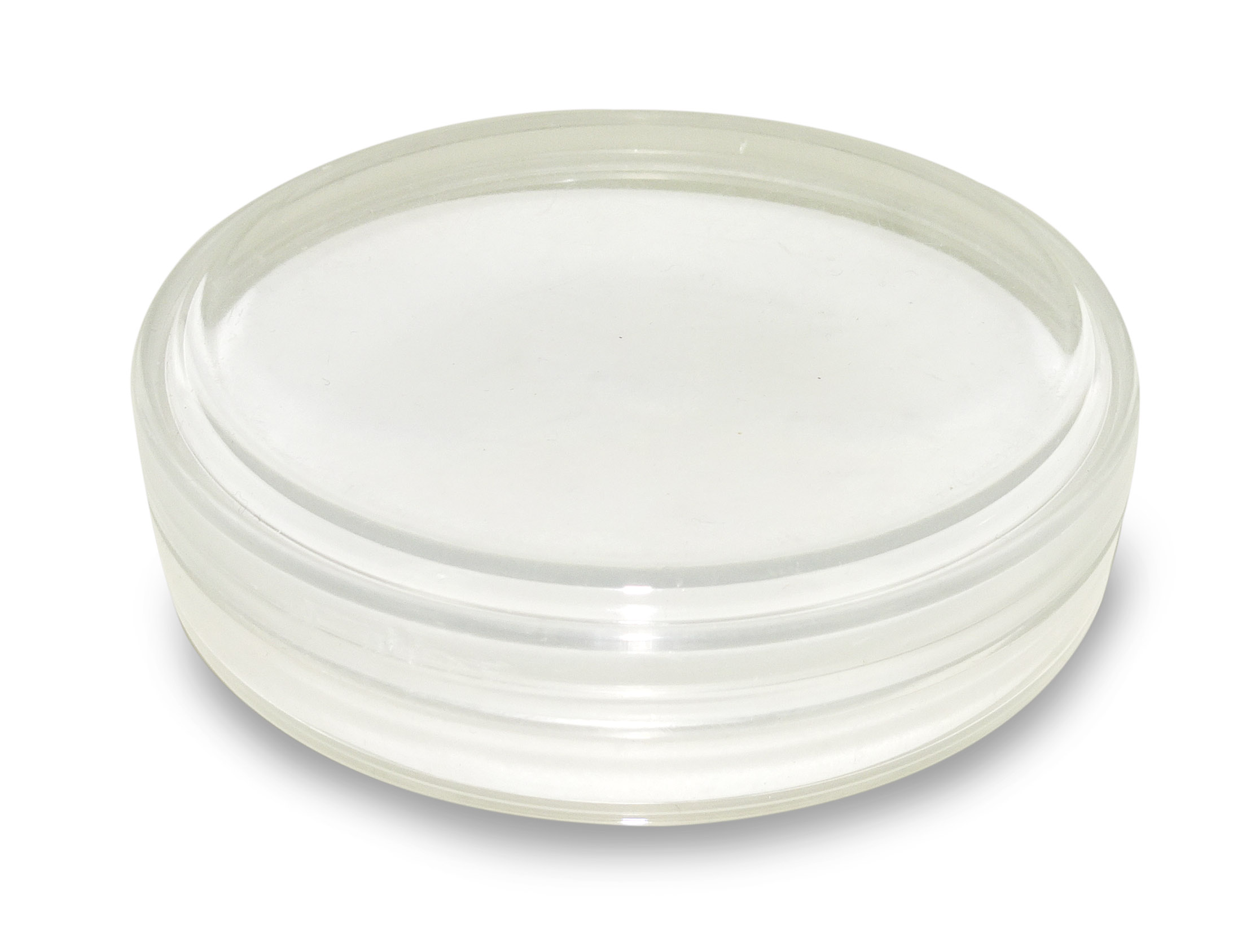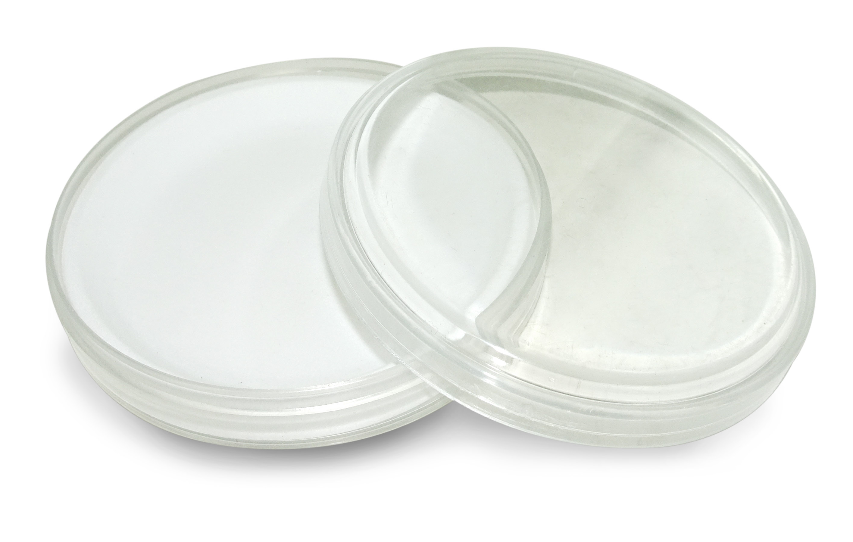 Originale scatolina portarosario in plastica rigida trasparente con forma tonda.