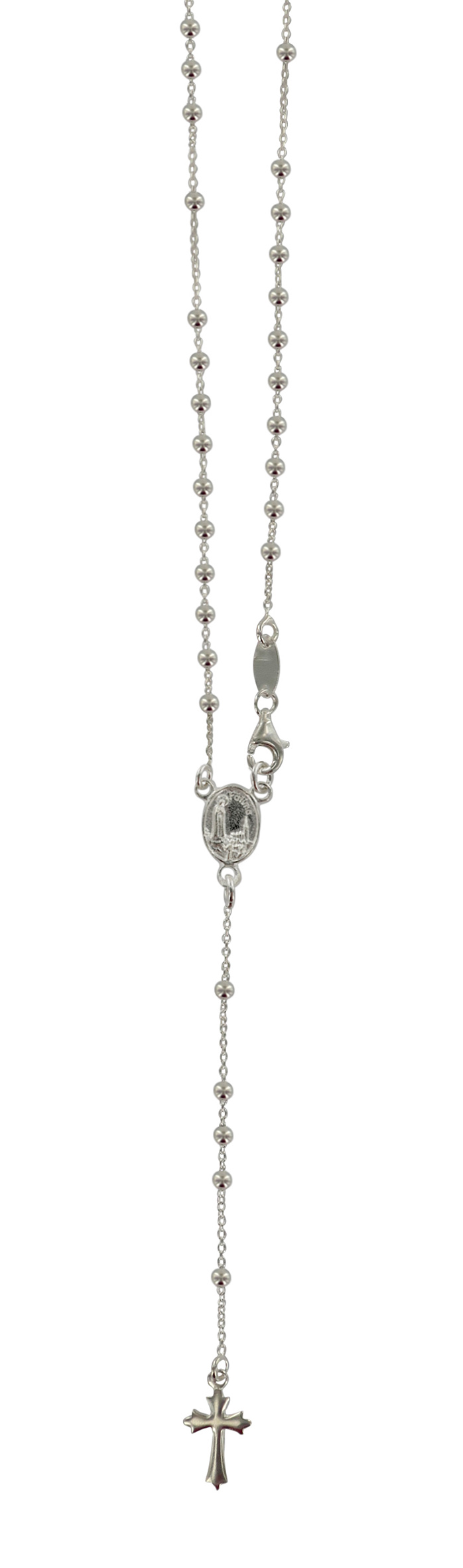 Il rosario si presenta con grani di mm 3 lucidi. La crociera ovale rappresenta la Madonna di Fatima e misura cm 1,2 mentre la croce anch'essa in argento lucido misura cm 1,5.