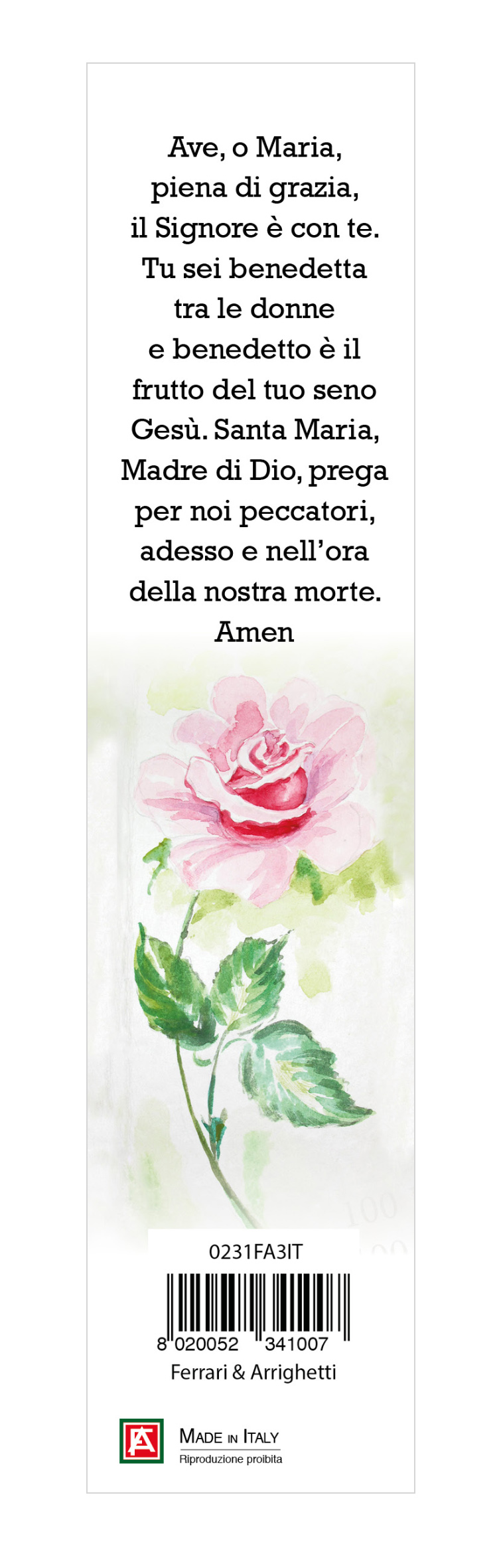 Il rosario è confezionato in un cartoncino con l'immagine della Madonna Fatima, sul retro vi è una preghiera dedicata a lei il tutto infilato in una busta trasparente.